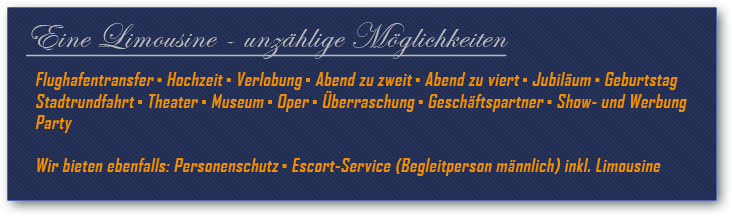 Eine Hochzeitslimousine - mit Extravaganz und Stil ins Glück zu ZweitDer schönste Tag Ihres Lebens: Ihre Hochzeit! An diesem einzigartigen Tag sollten Sie die Wahl Ihrer Hochzeitslimousine nicht dem Zufall überlassen. Erleben Sie eine außergewöhnliche Fahrt in einem ganz außergewöhnlichen Fahrzeug und genießen Sie dabei die Vorzüge eines zuverlässigen Chauffeurs. Pünktlich und mit besten Umgangsformen chauffiert er Sie in unserer exklusiven, weltweit nur 12mal gebauten Stretchlimousine an diesem ganz besonderen Tag ins Glück. Stoßen Sie während der Fahrt mit einem Glas Sekt aus der Bar an und genießen sie Ihren großen Tag. Gerne kümmen wir uns auch um den Wagenschmuck und dekorieren die Stretchlimousine ganz nach Ihren Wünschen und Vorstellungen. Mit einer Stretchlimousine als Hochzeitsauto zeigen Sie Stil und Eleganz, und jeder wird Sie beneiden! |